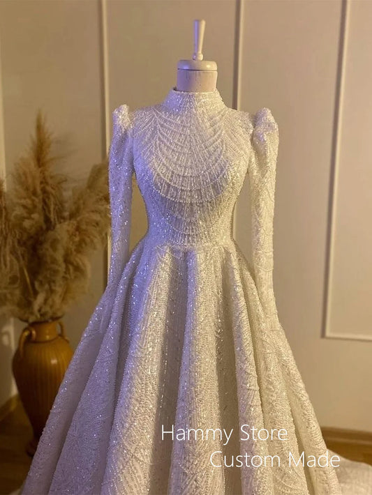 Exquisite Beading Wedding Dress Muslim Bridal Gown High Neck Pearls Sequined A Line Islamic Bride Dresses Robe De Mariage