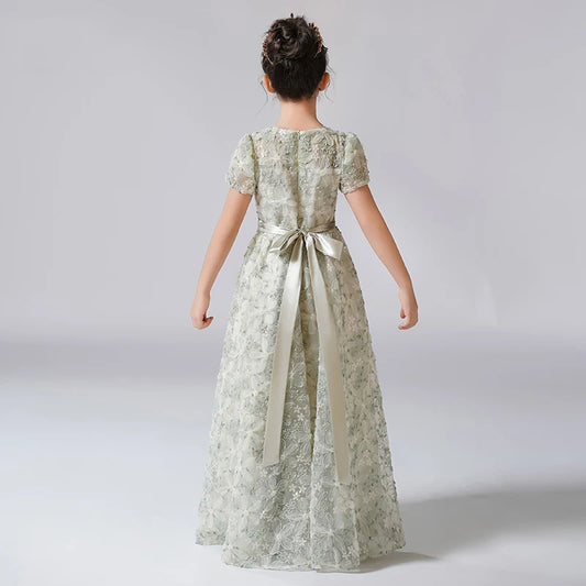 Dideyttawl Customized Dress For Girl Rhinestone Flower Lace Flower Girl Dresses Puff Sleeves Kids Birthday Formal Princess Gowns