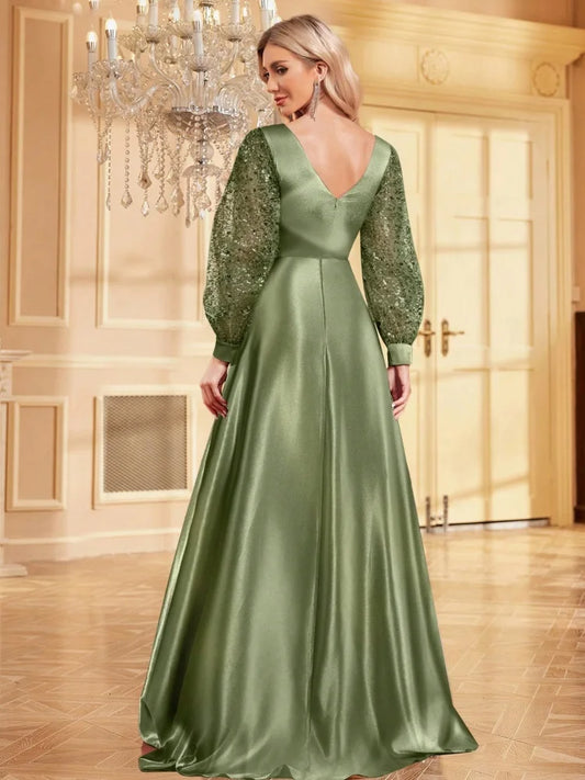 Luxury Long Sleeve Formal Evening Dress Deep V-Neck Floor-Length Gown Women 2024 Chiffon A-line Prom Cocktail Dress